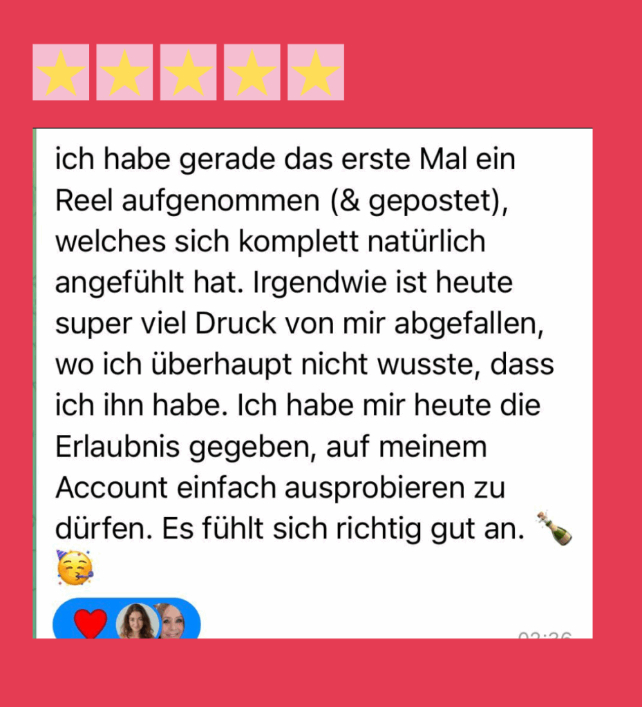 Sinja hat nach dem zweiten Modul ihre Story geteilt und noch am selben Tag eine Anfrage bekommen. Diana hat ihre Kernbotschaft beim Einkaufen laut gesagt und sofort Resonanz bekommen. Das kann schnell gehen — wenn du wirklich reingehst. Was ich dir nicht verspreche: einen bestimmten Zeitraum. Aber es ist keine Frage OB es funktioniert, sondern nur wann und wie sehr du bereit bist auch dranzubleiben.