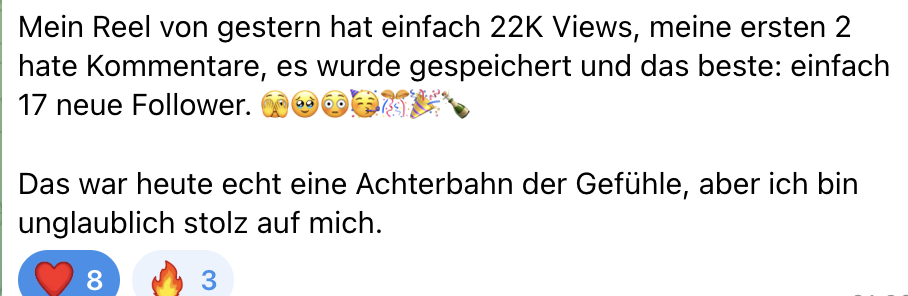 "Alter Schwede Lisa, ich glaube du kannst Zaubern! 😂 Du sagst ja immer, dass wir an die eine Person denken sollen, für die wir das Reel machen und zack, kommt da so ein Kommentar!!! Und das trotz super geringer Viewzahlen! Du bist echt der Knaller und dein neues Produkt bzw. deine Arbeit funktioniert schon, bevor ich überhaupt alles ausgearbeitet habe!!! 🚀"